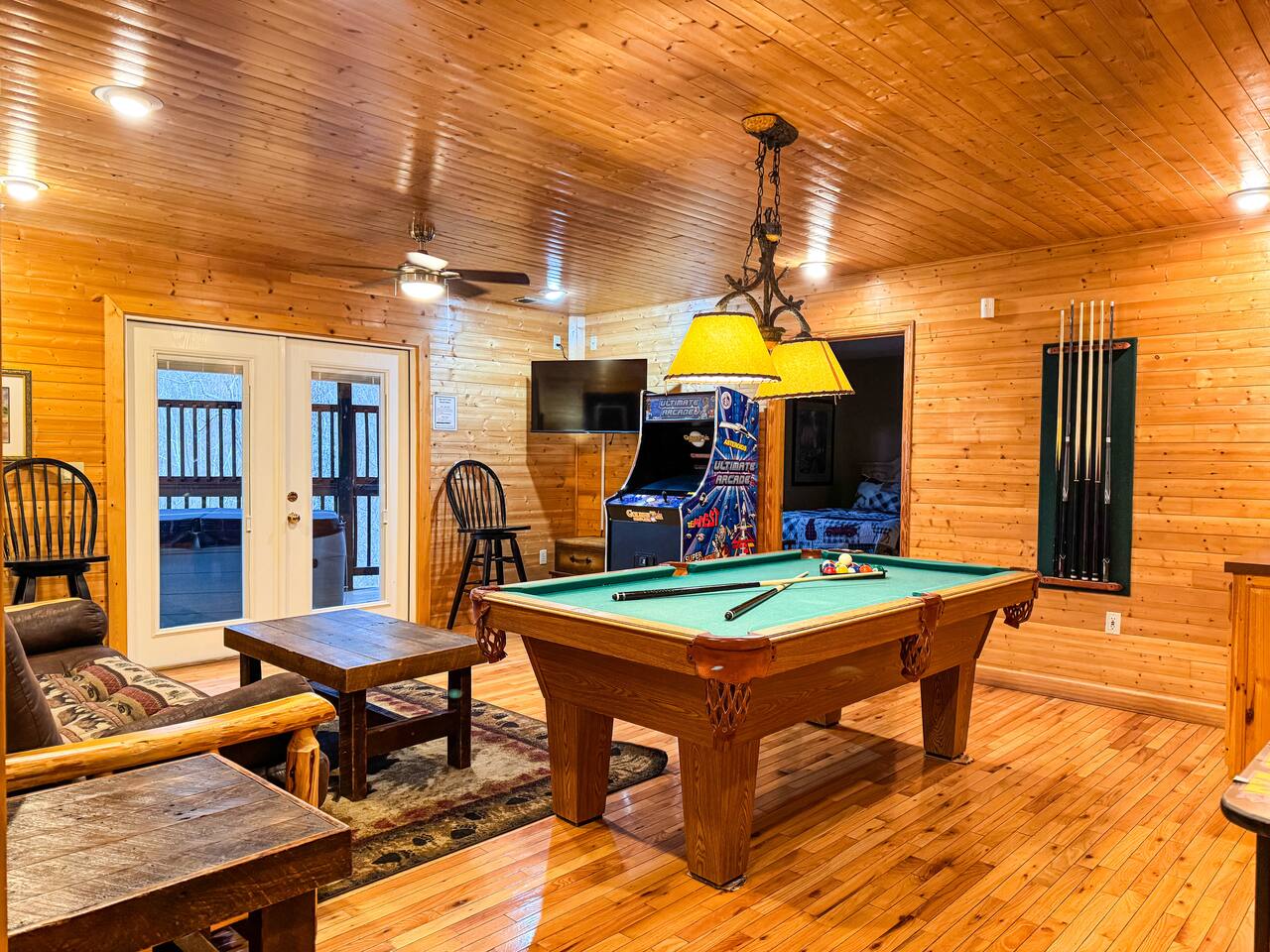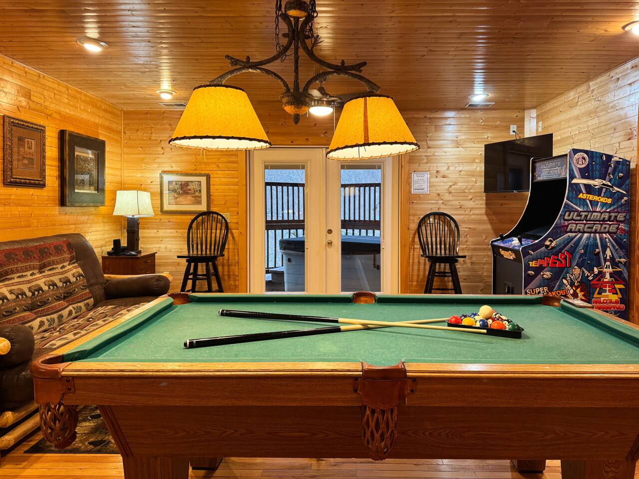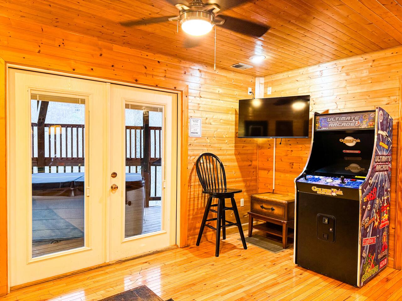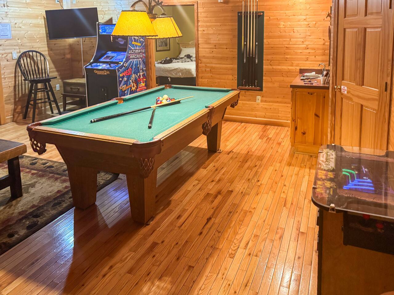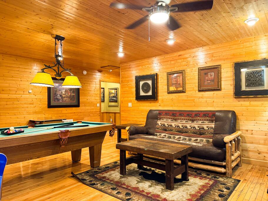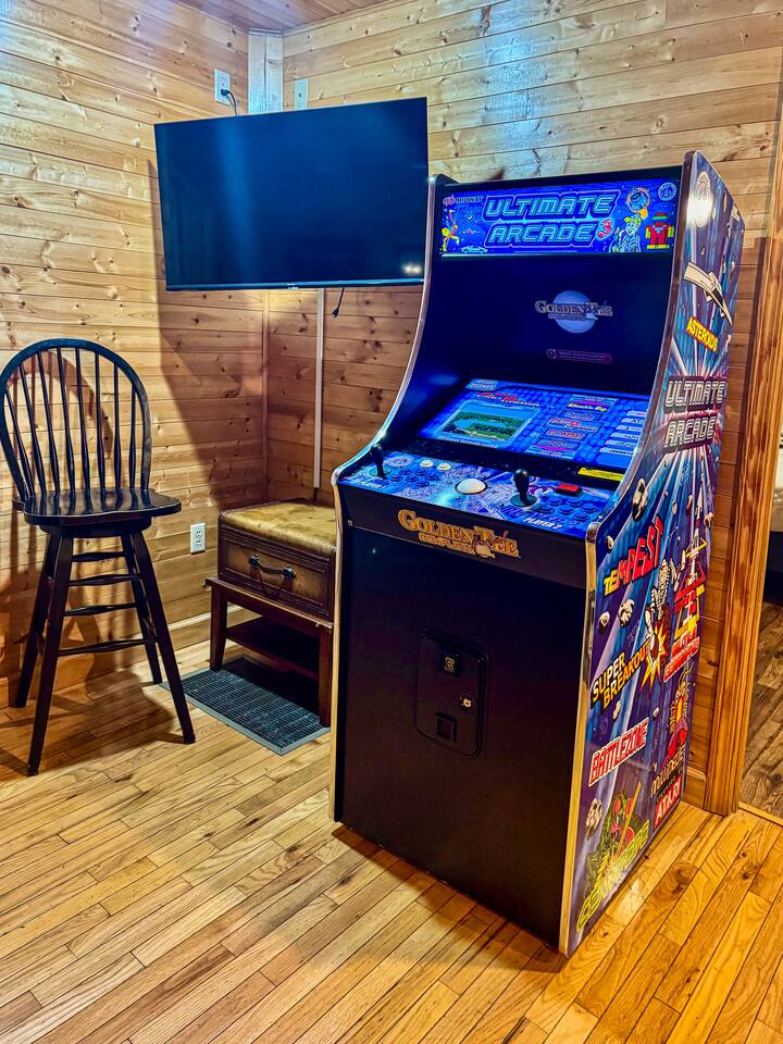 Welcome to Golden Castle Cabin - your perfect escape to the Great Smoky Mountains. Unwind, relax, and breathe in the refreshing mountain air while enjoying the soothing sounds of morning birdsong. Enjoy the best of both worlds - peaceful mountain living just minutes from the area’s top attractions, including downtown Gatlinburg, the National Park, city trolley stops, Dollywood, Ober, the SkyLift, Pigeon Forge attractions, unique Tennessee homemade wine tastings, and more - offering entertainment and relaxation for all age groups. • 5 minutes to Gatlinburg downtown strip • 1 mile to Anakeesta, Ripley's Mountain Coaster, Aquarium, Sky Bridge • 1 mile to trout fishing spot • 5 miles to Ober Ski Mountain • 10 miles to Dollywood, Pigeon Forge • 11 miles to Parrot Mountain • Plus, many other attractions near the cabin • 2 miles - Chalet Village cabins This stunning two-story log family cabin offers 2,400 square feet of luxurious living space, making it the perfect mountain retreat. The home features: Hardwood floors - Vaulted ceilings - Game room with Arcade Games - Four en suite bedrooms with full baths. NOTE: Please browse through the detailed pictures for a better view and understanding of the cabin's layout and amenities. Don't hesitate to SEND US A MESSAGE if you need any clarification. We would be happy to assist you as quickly as possible. VIEWS: In winter, the cabin offers stunning mountain views, while in summer, the trees create a cozy and enjoyable atmosphere, still allowing natural seclusion and tranquility with some beautiful sights from three outdoor spaces, including a spacious second-story deck with a bistro table and chairs. Each bedroom has direct access to one of the decks, and the picnic area is perfect for grilling as the sun sets. LIVING ROOM: Unwind on the theater-style reclining couches and enjoy your favorite movies or shows on the 65” Smart TV, set beside a cozy electric fireplace. BONUS LIVING ROOM (DOWNSTAIRS): Challenge friends to a game on the pool table or enjoy two arcade games while watching your favorite shows on the 45” LED Smart TV. The wet bar offers the perfect spot to craft a beverage before heading to the lower deck. KITCHEN & DINING: The well-equipped kitchen boasts stainless steel appliances and ample storage. Gather around the dining table to share meals and create lasting memories in this inviting space. PRIMARY SUITE: The primary suite features an electric fireplace and a spacious walk-in closet, while three of the bedrooms come equipped with Smart TVs for added comfort and entertainment EXPLORE THIS AREA: Conveniently located just 1 mile from downtown Gatlinburg, where you can explore culinary gems, an aquarium, a water park, a rope course, zip lines, and museums. Spend a fun-filled day at Ober Gatlinburg, a ski resort and amusement park perfect for winter sports and year-round entertainment. For evening fun, visit the Gatlinburg Space Needle, featuring an observation deck, arcade, and movie theater. Immerse yourself in nature at the Great Smoky Mountains National Park, just 4 miles away, with the Sugarlands Visitor Center serving as the perfect starting point for your adventure. ADDITIONAL AMENITIES: Washer/dryer - Complimentary high-speed Wi-Fi THINGS TO KNOW: 🚫 No pets allowed. 🚗 4WD or traction is recommended during snow or challenging weather conditions but is not required in the summer. PARKING: 🚗 Ample parking for 4+ vehicles—a rare find for mountain cabins! GUEST ENTRY: This home uses an E-lock with a unique code that resets after each guest's stay. 🐻 SMOKY MOUNTAIN BEARS: Seeing bears is one of the most exciting and memorable parts of visiting the Smokies! To help keep them (and you) safe: • Don’t leave food in your car or outside the cabin • Keep all doors locked • Secure trash cans as instructed • And most importantly, please don’t feed the bears The Smoky Mountains are their home - we’re just guests here 😊 We are a family-owned and operated business, and we absolutely love the Smokies! We work hard to ensure you have a perfect stay and would be truly delighted to host you as our guests.