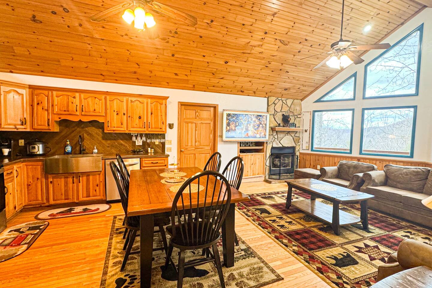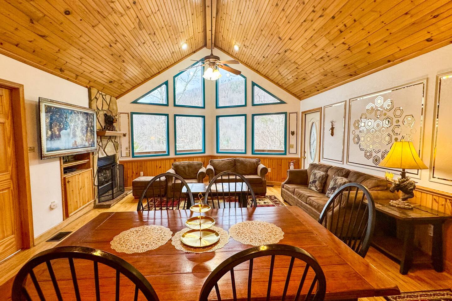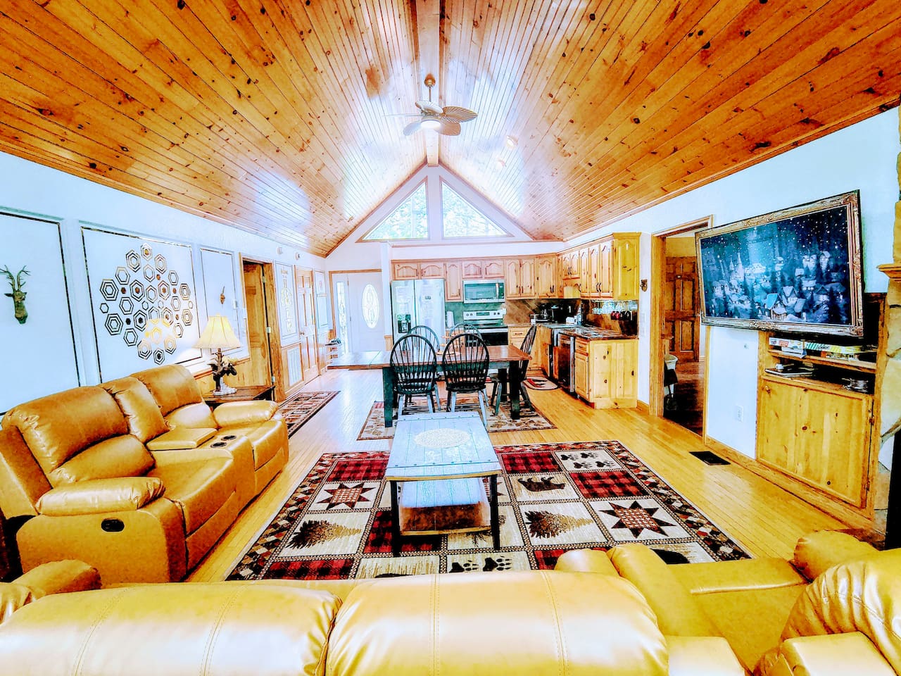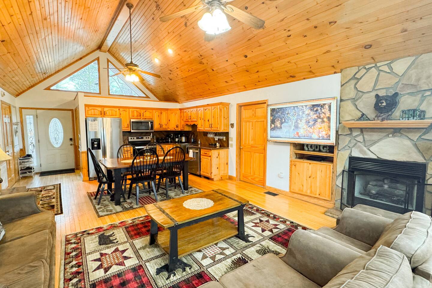 Welcome to Golden Castle Cabin - your perfect escape to the Great Smoky Mountains. Unwind, relax, and breathe in the refreshing mountain air while enjoying the soothing sounds of morning birdsong. Enjoy the best of both worlds - peaceful mountain living just minutes from the area’s top attractions, including downtown Gatlinburg, the National Park, city trolley stops, Dollywood, Ober, the SkyLift, Pigeon Forge attractions, unique Tennessee homemade wine tastings, and more - offering entertainment and relaxation for all age groups. • 5 minutes to Gatlinburg downtown strip • 1 mile to Anakeesta, Ripley's Mountain Coaster, Aquarium, Sky Bridge • 1 mile to trout fishing spot • 5 miles to Ober Ski Mountain • 10 miles to Dollywood, Pigeon Forge • 11 miles to Parrot Mountain • Plus, many other attractions near the cabin • 2 miles - Chalet Village cabins This stunning two-story log family cabin offers 2,400 square feet of luxurious living space, making it the perfect mountain retreat. The home features: Hardwood floors - Vaulted ceilings - Game room with Arcade Games - Four en suite bedrooms with full baths. NOTE: Please browse through the detailed pictures for a better view and understanding of the cabin's layout and amenities. Don't hesitate to SEND US A MESSAGE if you need any clarification. We would be happy to assist you as quickly as possible. VIEWS: In winter, the cabin offers stunning mountain views, while in summer, the trees create a cozy and enjoyable atmosphere, still allowing natural seclusion and tranquility with some beautiful sights from three outdoor spaces, including a spacious second-story deck with a bistro table and chairs. Each bedroom has direct access to one of the decks, and the picnic area is perfect for grilling as the sun sets. LIVING ROOM: Unwind on the theater-style reclining couches and enjoy your favorite movies or shows on the 65” Smart TV, set beside a cozy electric fireplace. BONUS LIVING ROOM (DOWNSTAIRS): Challenge friends to a game on the pool table or enjoy two arcade games while watching your favorite shows on the 45” LED Smart TV. The wet bar offers the perfect spot to craft a beverage before heading to the lower deck. KITCHEN & DINING: The well-equipped kitchen boasts stainless steel appliances and ample storage. Gather around the dining table to share meals and create lasting memories in this inviting space. PRIMARY SUITE: The primary suite features an electric fireplace and a spacious walk-in closet, while three of the bedrooms come equipped with Smart TVs for added comfort and entertainment EXPLORE THIS AREA: Conveniently located just 1 mile from downtown Gatlinburg, where you can explore culinary gems, an aquarium, a water park, a rope course, zip lines, and museums. Spend a fun-filled day at Ober Gatlinburg, a ski resort and amusement park perfect for winter sports and year-round entertainment. For evening fun, visit the Gatlinburg Space Needle, featuring an observation deck, arcade, and movie theater. Immerse yourself in nature at the Great Smoky Mountains National Park, just 4 miles away, with the Sugarlands Visitor Center serving as the perfect starting point for your adventure. ADDITIONAL AMENITIES: Washer/dryer - Complimentary high-speed Wi-Fi THINGS TO KNOW: 🚫 No pets allowed. 🚗 4WD or traction is recommended during snow or challenging weather conditions but is not required in the summer. PARKING: 🚗 Ample parking for 4+ vehicles—a rare find for mountain cabins! GUEST ENTRY: This home uses an E-lock with a unique code that resets after each guest's stay. 🐻 SMOKY MOUNTAIN BEARS: Seeing bears is one of the most exciting and memorable parts of visiting the Smokies! To help keep them (and you) safe: • Don’t leave food in your car or outside the cabin • Keep all doors locked • Secure trash cans as instructed • And most importantly, please don’t feed the bears The Smoky Mountains are their home - we’re just guests here 😊 We are a family-owned and operated business, and we absolutely love the Smokies! We work hard to ensure you have a perfect stay and would be truly delighted to host you as our guests.